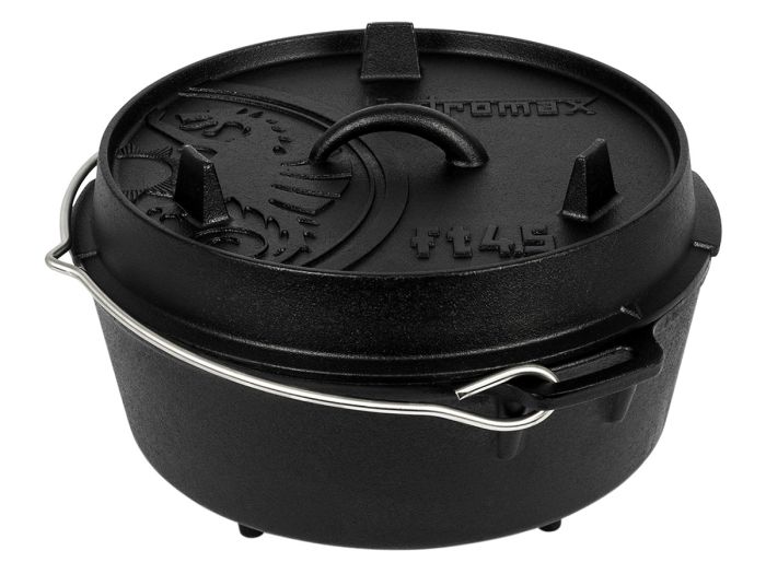 Der Topf ist perfekt zum Kochen über offenem Feuer oder heißen Kohlen. Das massive Gusseisen verteilt die Wärme so, dass der Topf ohne Probleme zum Braten, Backen, Frittieren, Kochen oder Schmoren verwendet werden kann. Der Topf ist mit einer vorbehandelten Beschichtung versehen, die das Anhaften und Rosten verhindert. An der Unterseite des Topfes befinden sich 3 kleine Füße, damit der Topf stabil im Feuer platziert werden kann. Der Deckel des Topfs kann auch als Bratpfanne, Snackschale oder Teller verwendet werden. Zudem hat der Topf eine kleine Öffnung für die Verwendung eines Thermometers und einen Griff zum Tragen des Topfes oder zum Aufhängen über dem Feuer.