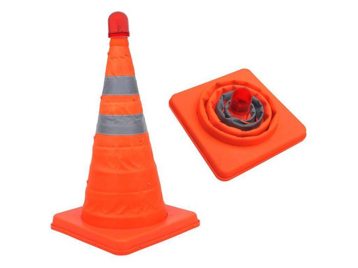 Der ProPlus LED Sicherheitspylon mit blinkender LED-Beleuchtung ist faltbar und hat zwei reflektierende Streifen. Der Kegel wird in einer praktischen Tragetasche zum Aufbewahren und Transport geliefert und funktioniert mit 2x AAA-Batterien.