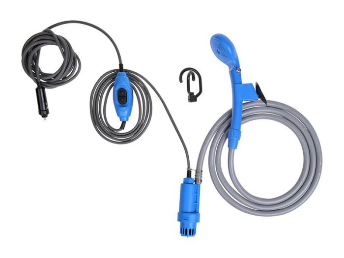 Das Duschset wird mit einem Aufhängehaken und einer praktischen Aufbewahrungstasche geliefert. Die Dusche lässt sich einfach an eine 12-Volt-Steckdose anschließen.