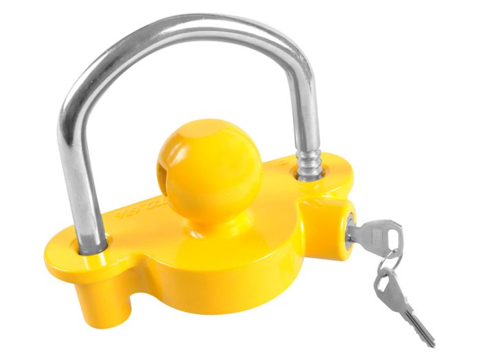 Das ProPlus Kupplungschloss in gelb ist ein universelles Kupplungschloss, das für nahezu alle Kupplungen geeignet ist. Es wird mit einem Zylinderschloss und 2 Schlüsseln geliefert.