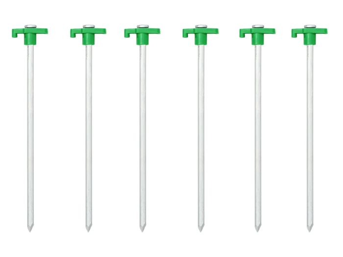 Dieses Set besteht aus sechs 25 cm langen ProPlus Felsbodenheringen mit Kunststoffhaken. Dank des runden Kopfes können Sie diese Heringe ganz einfach mit einem Hammer in den Boden hämmern. An dem Kunststoffhaken befestigen Sie das Zeltgummi oder eine Abspannleine.