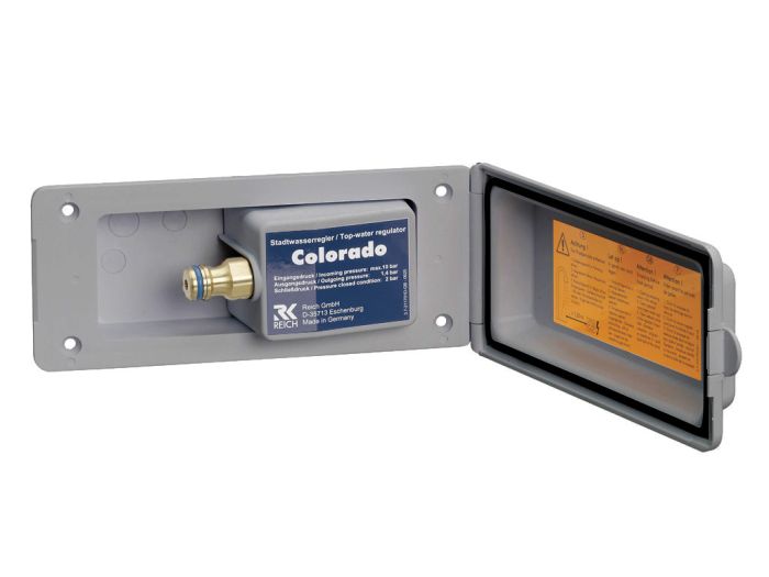 Der Reich Colorado Light grey Außenwandanschluss dient zum direkten Anschluss an das öffentliche Wassernetz. Tanks oder Kanister werden durch ein Rückschlagventil vor dem Tank oder Kanister umgangen. Der integrierte Regler mit Rückschlagventil ist für einen Eingangsdruck von bis zu 12 bar geeignet und reduziert diesen auf einen Ausgangsdruck von 0,7 bar. Der Schließdruck beträgt 1,1 bar.