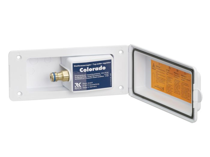 Der Reich Colorado White Außenwandanschluss dient zum direkten Anschluss an das öffentliche Wassernetz. Tanks oder Kanister werden durch ein Rückschlagventil vor dem Tank oder Kanister umgangen. Der integrierte Regler mit Rückschlagventil ist für einen Eingangsdruck von bis zu 12 bar geeignet und reduziert diesen auf einen Ausgangsdruck von 0,7 bar. Der Schließdruck beträgt 1,1 bar.