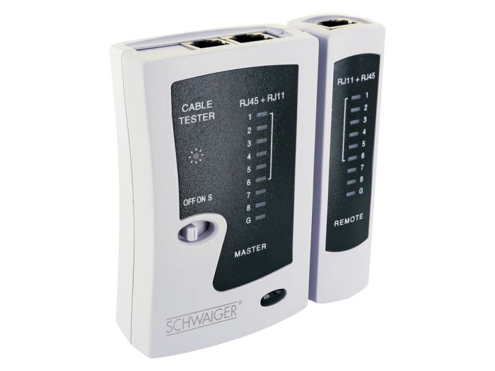 Mit diesem Schwaiger Netzwerkkabeltester ist es möglich, ein Netzwerk- oder ISDN-Kabel auf dessen Funktionsfähigkeit zu prüfen. Der Tester besteht aus einer Master- und einer Remoteeinheit mit je einer RJ45- und einer RJ11- Buchse. Das Gerät kann sowohl Kabel als auch bereits verlegte Kabelstrecken schnell und zuverlässig prüfen. Der Netzwerktester gibt Ihnen somit die Möglichkeit, auf einfache Weise die PIN-Belegung eines RJ45- oder RJ11-Kabels zu testen.