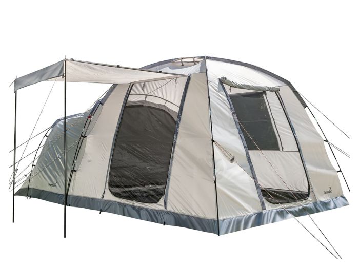 Der fast quadratische Kuppelbereich des Zeltes hat eine Höhe von satten 230 cm und bietet selbst für große Menschen viel Bewegungsfreiheit. Zwei mit Moskitonetz ausgestattete Eingänge ermöglichen eine große Flexibilität und sorgen für eine gute Luftzirkulation im Zelt, ohne dabei lästigen Insekten den Zutritt zu gewähren. Mit Hilfe der zwei mitgelieferten Aufstellstangen kann eine der beiden Türen als Sonnensegel aufgestellt werden, um bei starker Sonneneinstrahlung Schatten im Eingangsbereich zu spenden. Ein großes Folienfenster mit Netzeinsatz sorgt auch bei geschlossenen Türen für viel Licht und frische Luft, kann jedoch von außen bei Bedarf für mehr Privatsphäre auch wetterfest abgedeckt werden.
