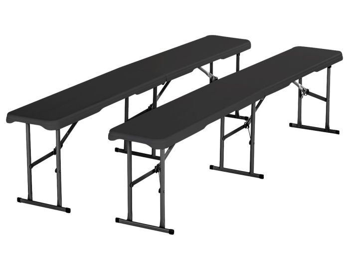 Hier im 2er-Set bieten die bequemen Bänke jeweils Platz für bis zu fünf Personen und dank cleverer Klappfunktion sind sie platzsparend aufzubewahren und einfach zu transportieren.