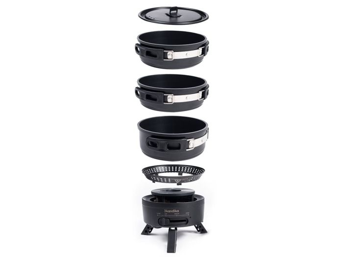 Leckere Mahlzeiten zaubern ohne sperrige Kochausrüstung ist mit dem Skandika Hybrid-Campingkocher Rask immer und überall möglich. Der dual betriebene Kocher mit passenden Töpfen nutzt entweder Strom oder Gas als Energiequelle und sprengt damit die Grenzen eines herkömmlichen Campingkochers. Dank des cleveren Stapelsystems lässt sich der Kocher samt Töpfen und Pfanne zudem kompakt und handlich verstauen und bietet somit eine perfekte, leicht tragbare Lösung für fast jede Kochsituation, ob auf dem Campingplatz, zu Hause oder auf Reisen.