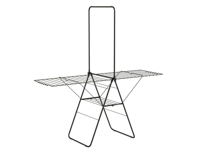 25 Meter Trockenfläche für bis zu drei Maschinenladungen. Höhenverstellbare Flügel und Hängerstange mit Haken für knitterfreies Trocknen. Eingeklappt nur fünf Zentimeter tief. Sicher zu transportieren und schonend für Böden durch Schutzkappen.