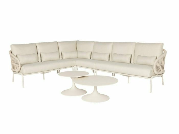 Dieses Loungeset ist nicht nur stilvoll, sondern auch praktisch und langlebig. Das Suns Tosca Eck-Loungeset wird mit 2 passenden Loungetischen von Ø60 cm und Ø80 cm geliefert. Das cremefarbene Aluminiumgestell ist leicht und robust, während der Seilbezug aus hochwertigem Textilene für einen schicken, modernen Look sorgt. Die dicken, abnehmbaren Kissen sind leicht zu reinigen und bieten optimalen Sitzkomfort. Außerdem lässt sich das Set mit einem passenden Loungesessel, Hocker oder Esszimmerstuhl (separat erhältlich) erweitern, so dass Sie Ihre Lounge-Ecke ganz nach Wunsch zusammenstellen können. Mit dem Suns Tosca Eckloungeset entscheiden Sie sich für Eleganz, Komfort und Vielseitigkeit in einem!