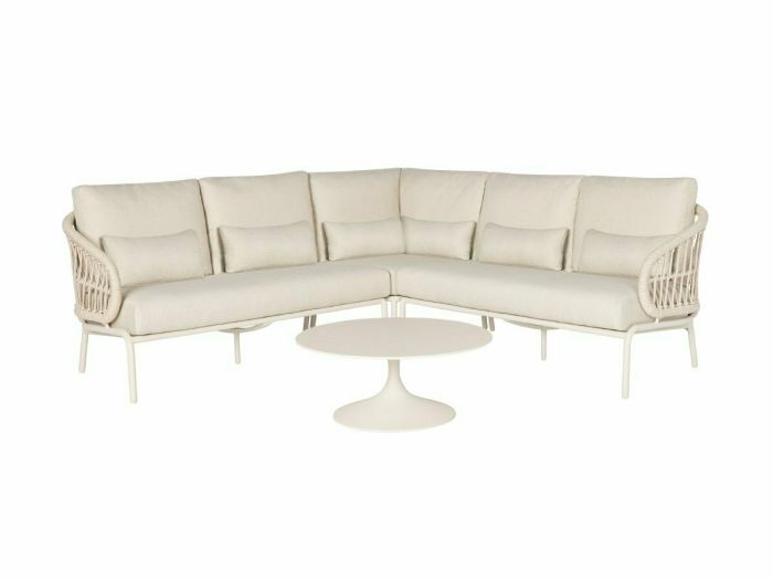 Dieses Loungeset ist nicht nur stilvoll, sondern auch praktisch und langlebig. Der cremefarbene Aluminiumrahmen ist leicht und stabil, während der Seilbezug aus hochwertigem Textilene für einen schicken, modernen Look sorgt. Die dicken, abnehmbaren Kissen sind leicht zu reinigen und bieten optimalen Sitzkomfort. Außerdem kann das Set mit einem passenden Loungesessel, Hocker oder Esszimmerstuhl oder einem zusätzlichen Loungetisch (separat erhältlich) erweitert werden, so dass Sie Ihre Lounge-Ecke ganz nach Ihren Wünschen zusammenstellen können. Diese symmetrische Eckbank mit passendem Loungetisch (Ø80 cm) bietet eine Kombination aus Eleganz und höchstem Sitzkomfort, ideal für lange, entspannte Sommerabende.
