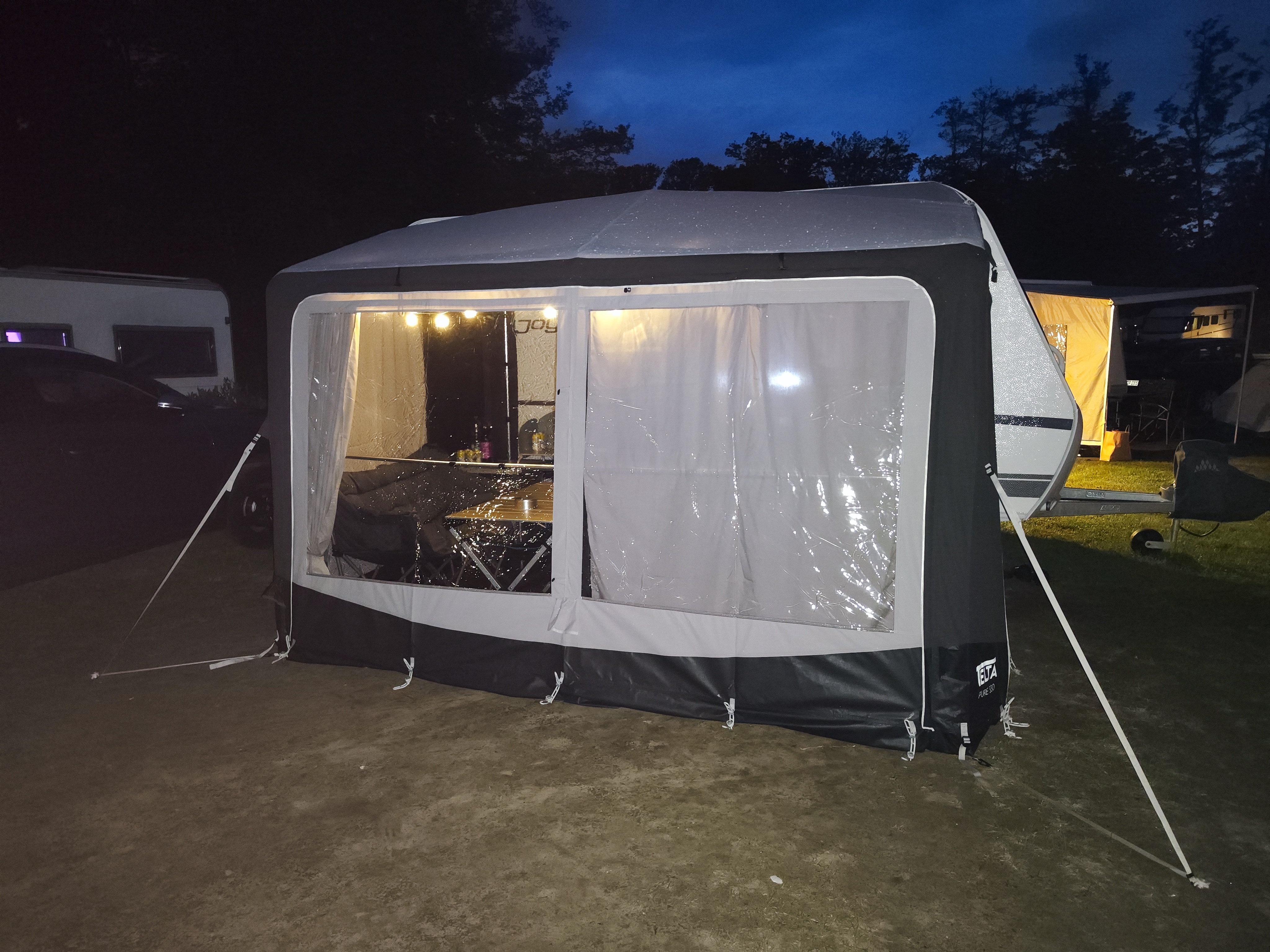 Das Aufstellen ist dank der verbundenen Luftschläuche, die alle über ein Ventil aufgepumpt werden können, ein Kinderspiel. Mit dem optionalen Anbau, Sturmbändern und Verandastangen, die auch als Kleiderstange verwendet werden können, machen Sie Ihr Telta Vorzelt komplett.