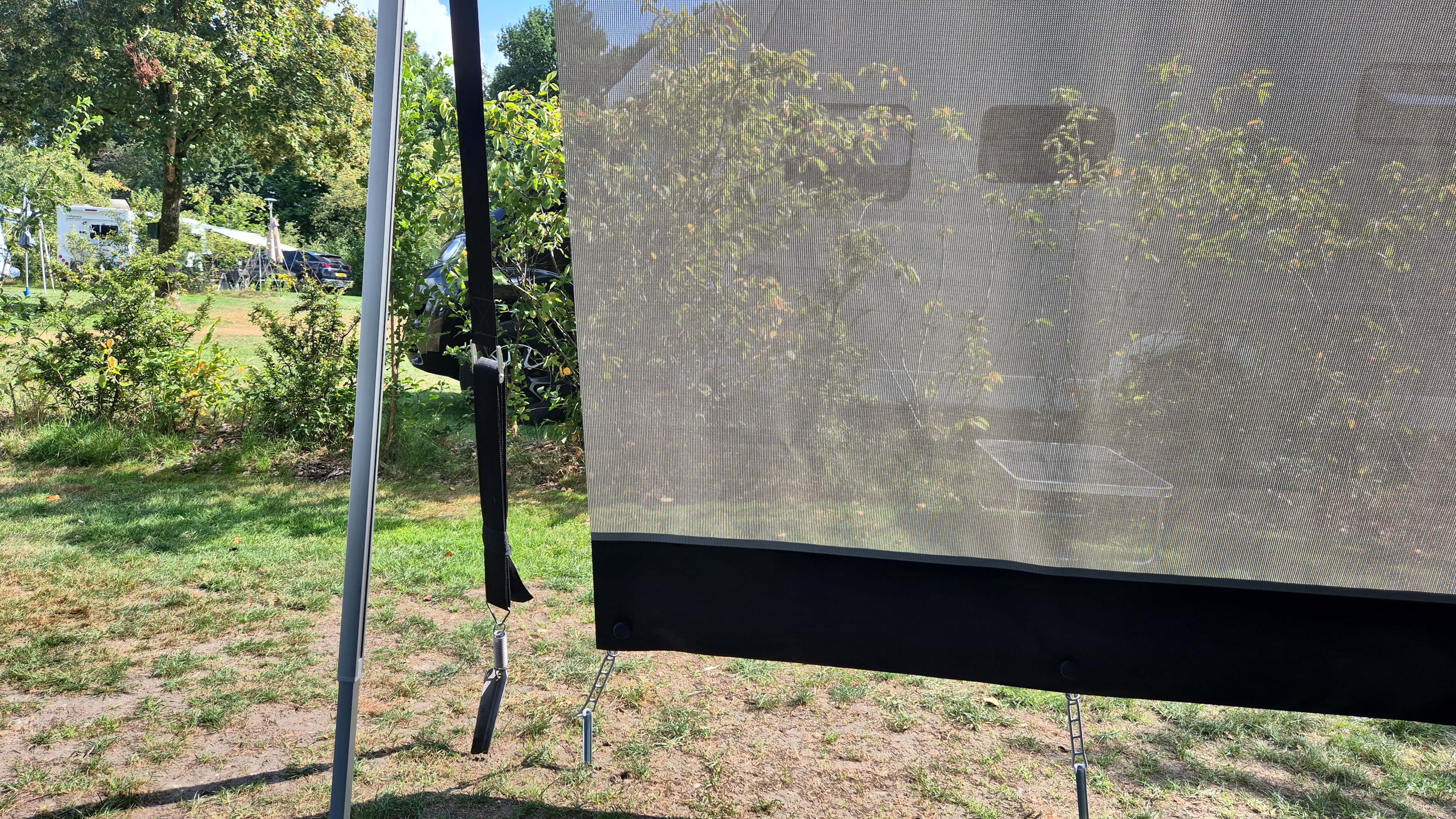 Die transparente Vorderwand lässt sich mit der Kederverbindung einfach und schnell in der Vorderschiene der Markise schieben. Die Sun Blocker Vorderwand ist licht- und luftdurchlässig, hält aber einen Großteil des Sonnenlichts und der Hitze ab. So können Sie komfortabel im Schatten sitzen und die schöne Aussicht genießen.