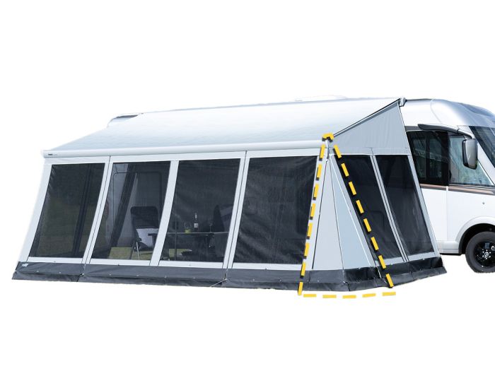 Die Wigo One Big Corner Erweiterungsecken vergrößern den Wohnraum des Wigo Rolli Markisenzeltes.